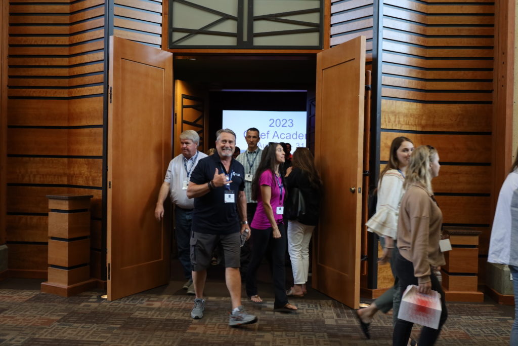 After a fast break for lunch catered by Monday Mornings, attendees crammed the theater, the place Greg Wells and Scott Harris welcomed everybody and gave updates on Chief Architect. They introduced our return to the Worldwide Builders Present and KBIS in early 2023 and invited the viewers to return to Chief Academy 2023 subsequent yr. Following Greg and Scott’s presentation, our customers bought a sneak peek at thrilling options the event staff is at the moment engaged on for upcoming releases. The primary day of coaching wrapped up with a night reception at a neighborhood sizzling spot, Le Peep Restaurant. Attendees and their visitors gathered underneath a cover of pink umbrellas alongside the Spokane River and made lasting connections over appetizers and drinks.